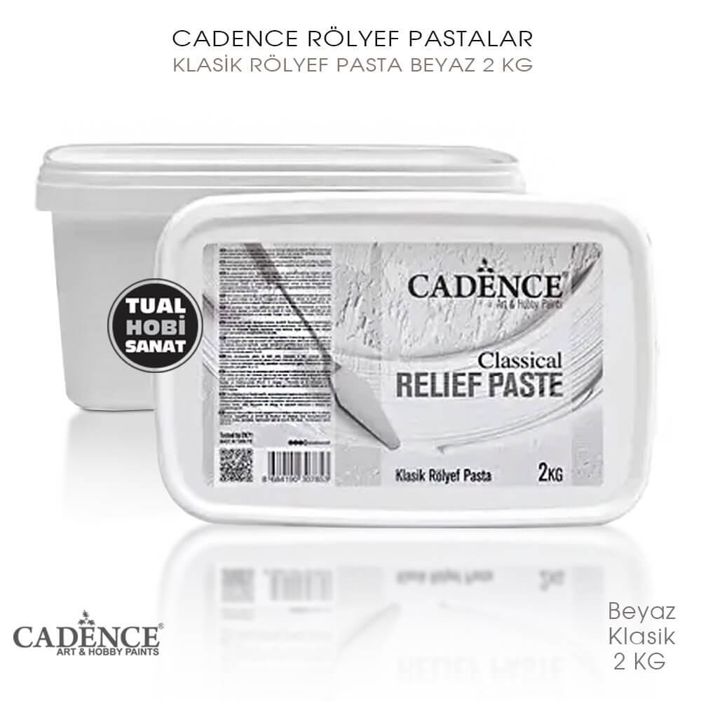 Cadence Klasik Rölyef Pasta, ahşap, metal, polyester, seramik, cam vb. her türlü yüzeyde kullanılabilen, stencil ve şablonlar vasıtasıyla veya spatula yardımı ile serbest çalışma yaparak kabartılı yüzeyler elde etmek üzere kullanılan, macunumsu, yumuşak fakat akıcı olmayan dolgu malzemesidir. Hobi projelerinde uzun yıllardır kullanılan rölyef pasta, popülerliğini çok ve esnek kullanımı sayesinde hiç yitirmemiştir.