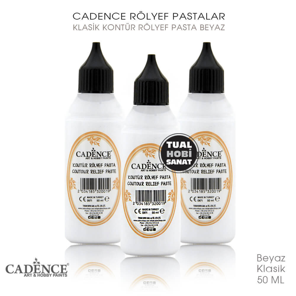 Cadence Kontür Rölyef Pasta, boyut vermek istediğiniz her türlü boyama ve süsleme projeleriniz için kullanabileceğiniz, kalem gibi tutulan yapısı ve ince ucuyla detaylı boyut çalışmaları yapabileceğiniz rölyef pastadır. Cadence Kontur Rölyef Pastalar dekoratif çalışmaların yanısıra polyester ve ahşap gibi yüzeylerin düzeltilmesi ve hatalarının giderilmesi için dolgu macunu olarak da sıklıkla kullanılmaktadır.