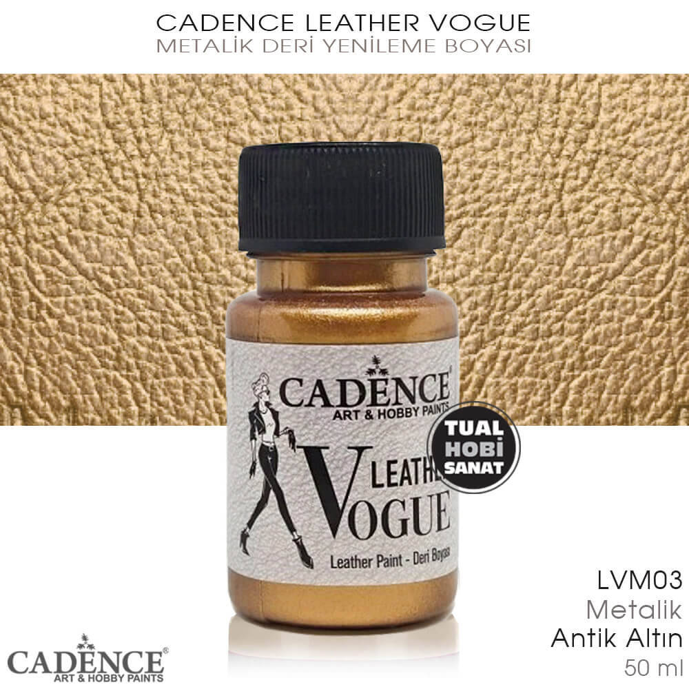 Gelince Haber VerCadence Leather Vogue Metalik Antik Altın Deri Boyaları, her türlü deri yüzeyde stencil yardımıyla veya serbest çalışma yaparak uygulanabilen, su bazlı ve yüksek kapatıcılığa sahip, kuruduktan sonra elastik kalabilen akrilik deri boyalarıdır. Cadence Leather Vogue deri boyalarıyla ayakkabı, çanta, cüzdan, kemer, sandalye kılıfı gibi tüm deri yüzeyli objeleri yeniliyebilir, rengini değiştirebilir veya üzerine desen çalışması yapabilirsiniz.
