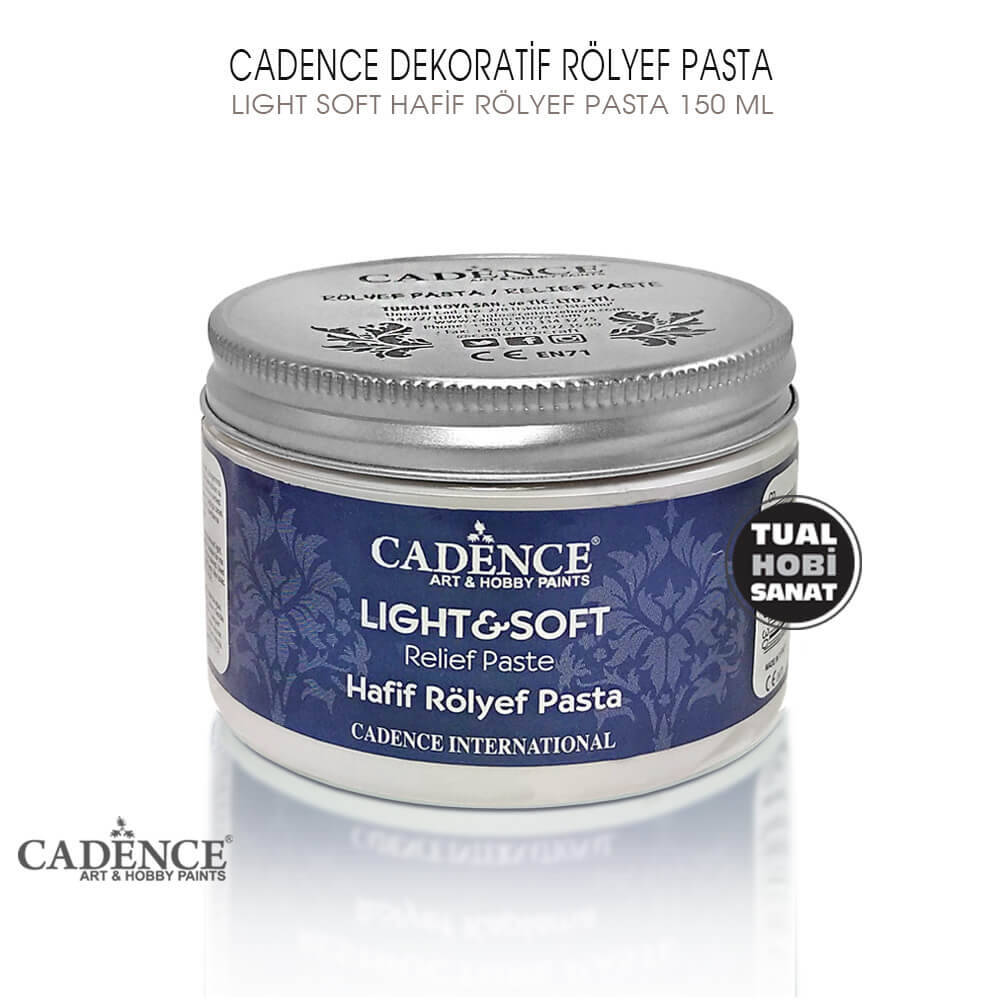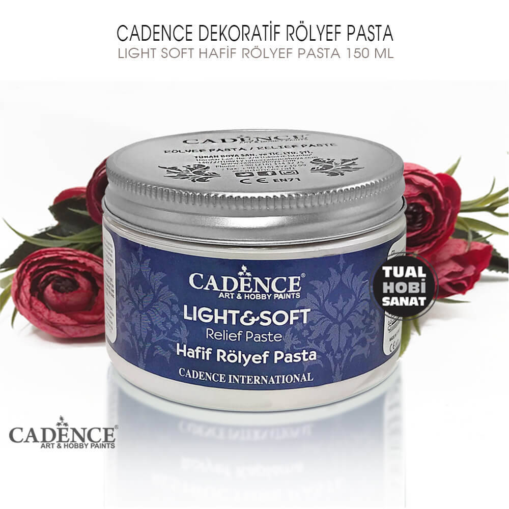 Cadence Light Soft Hafif Rölyef Pasta, her türlü yüzeyde, stencil, şablon ve pastacı şablonları kullanılarak, uygulandığı zeminde ağırlık yaratmayan, akrilik boyalarla karıştırılarak renklendirilebilen, üst düzey ve kolay kullanımlı bir rölyef macundur. Cadence Light Soft Hafif Rölyef Pasta, ince dantel ve normal silikon kalıplara doldurularak motif ve şekiller elde edilebilir.