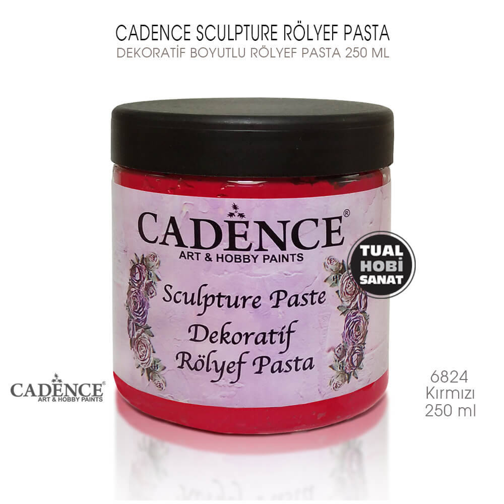 Cadence Sculpture Dekoratif Kırmızı Rölyef Pasta, ahşap, metal, polyester, seramik, cam vb. her türlü yüzeyde kullanılabilen, stencil ve şablonlar vasıtasıyla veya spatula yardımı ile serbest çalışma yaparak kabartılı yüzeyler elde etmek üzere kullanılan, macunumsu, içerisinde partikül parçacıklar bulunan ve pütürlü yüzey elde edilebilen, yumuşak fakat akıcı olmayan dolgu malzemesidir. Hobi projelerinde uzun yıllardır kullanılan rölyef pasta, popülerliğini çok ve esnek kullanımı sayesinde hiç yitirmemiştir.