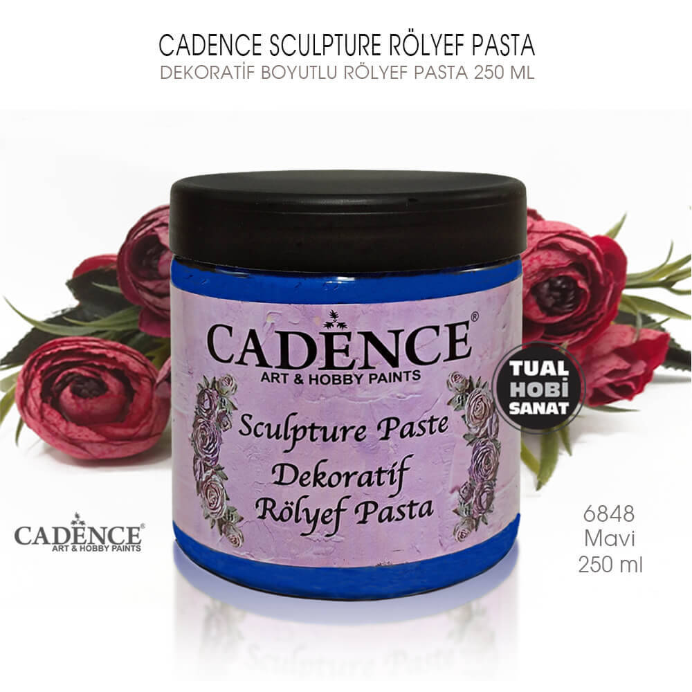 Cadence Sculpture Dekoratif Mavi Rölyef Pasta, ahşap, metal, polyester, seramik, cam vb. her türlü yüzeyde kullanılabilen, stencil ve şablonlar vasıtasıyla veya spatula yardımı ile serbest çalışma yaparak kabartılı yüzeyler elde etmek üzere kullanılan, macunumsu, içerisinde partikül parçacıklar bulunan ve pütürlü yüzey elde edilebilen, yumuşak fakat akıcı olmayan dolgu malzemesidir. Hobi projelerinde uzun yıllardır kullanılan rölyef pasta, popülerliğini çok ve esnek kullanımı sayesinde hiç yitirmemiştir.