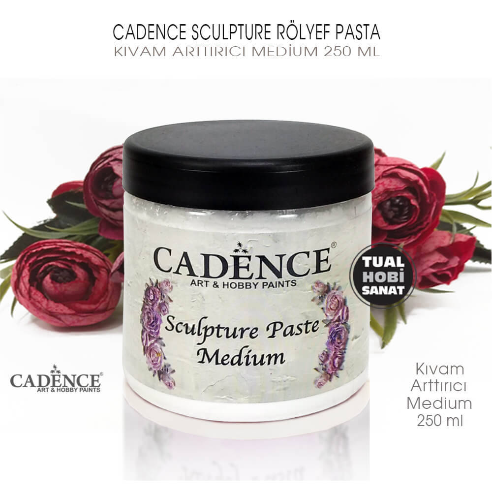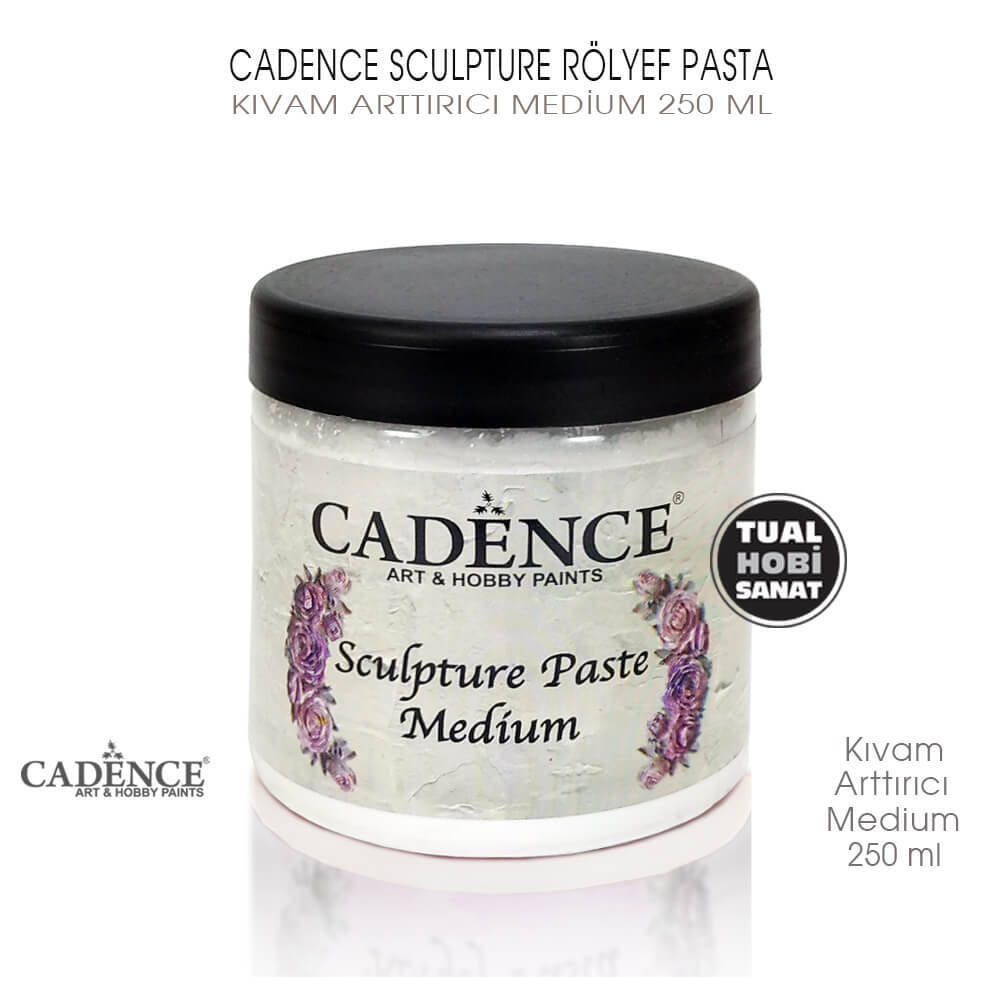 Cadence Sculpture Rölyef Pasta Kıvam Artırıcı Medyum, 250ml'lik ambalajlı halde satılmakta olup toz halindedir. Kıvam artırıcının kullanımının rölyef pastanın kuruma süresini kısaltacağını göz önüne alarak çalışmalarınızı yapınız.