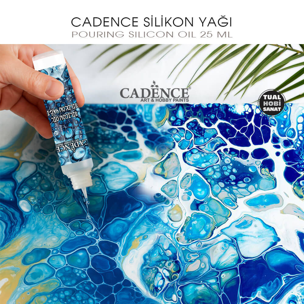 Cadence Silikon Yağı, pouring effect uygulamaları yaparken hücre görünümlü ebru desenleri yapmaya yarayan, boyalar ıslakken pürmüz ile ısıtıldığında etkisini artıran pouring effect katkı malzemesidir. Cadence Silikon Yağı 25 ml lik ambalajlarda satışa sunulmaktadır. Silikon yağı kuruduğu zaman da aynı ıslak görünümün korunmasını sağlar