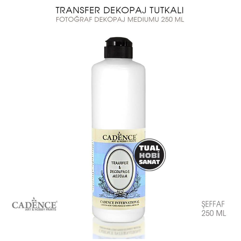 Gelince Haber VerCadence Transfer Dekopaj Tutkalları, ahşap, mdf, polyester, kağıt, cam ve kumaş gibi akrilik boyayla boyanmış düzgün tüm yüzeylerde kullanılan, bu zeminlere resim ve fotoğrafların fiziki olarak transfer olmasını sağlayan yapıştırıcılardır. Bu transfer yöntemine zor transfer uygulaması da denir. Tekniğin zor olmasına rağmen diğer dekupaj kağıdı yapıştırma işleminden farkı, yüzeyde kağıt kalınlığı bırakmamasıdır. Çünkü resim transfer edildikten sonra kağıt ıslatılarak soyulup çıkartılmaktadır.