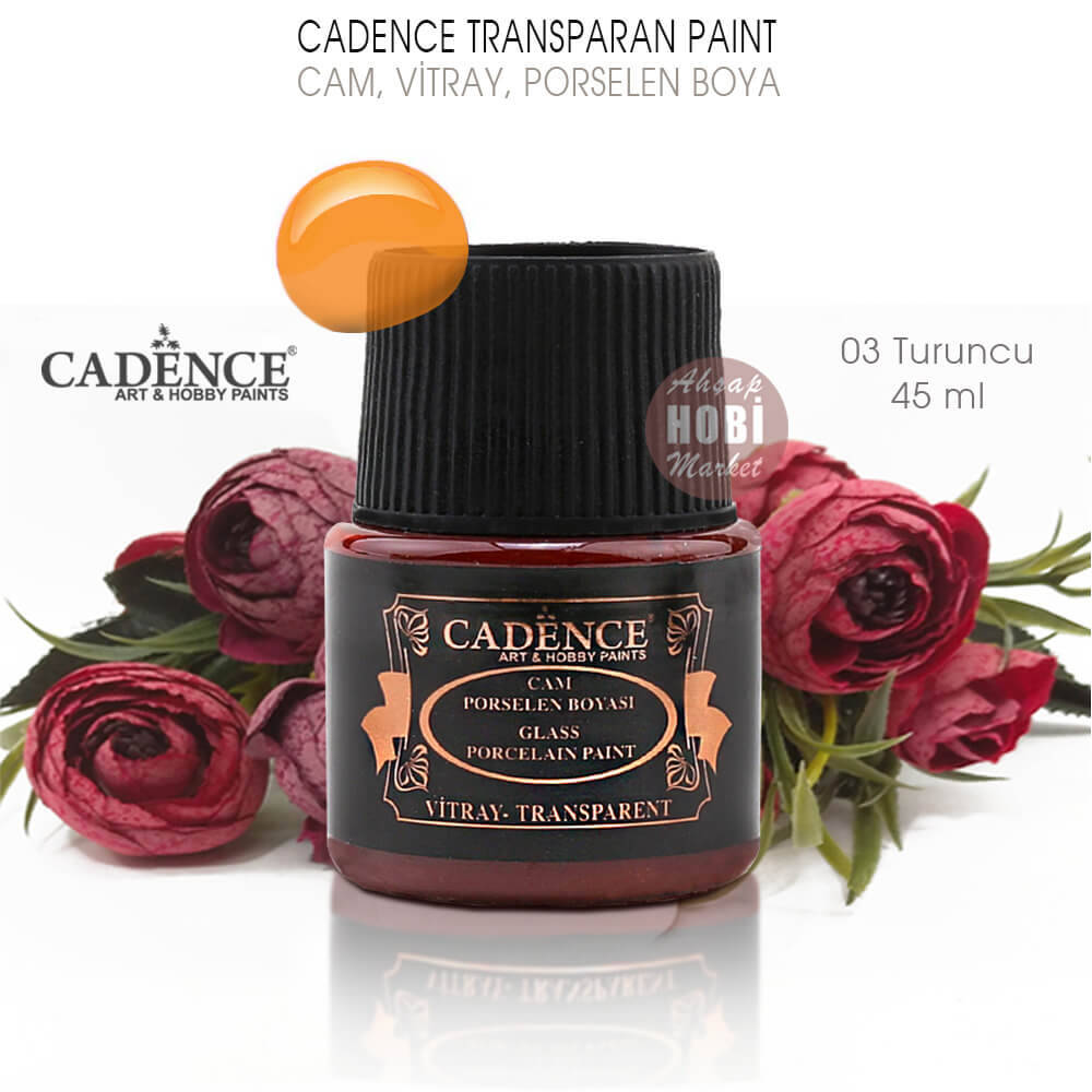 Cadence Turuncu Cam Vitray ve Porselen Yarı Transparan Boyaları, her türlü cam, porselen ve vitray çalışmalarında, metal yüzeylerde renklendirme amacıyla kullanılan, fırınlanabilir, su bazlı yarı şeffaf akrilik boyalardır. Su bazlı, içerisinde sağlığa zararlı toksik madde bulunmayan cam vitray ve porselen transparan boyalarını cam ve pencerelerinizde vitray çalışmaları için, dekoratif cam ve porselen tabaklarınızda süsleme amacıyla, camlara yazı yazmak ve metalleri hafif renklendirmek için kullanabilirsiniz. Ürün her katta daha az transparan hale gelir.