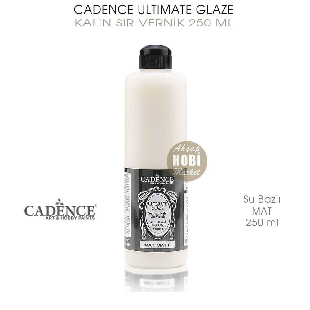 Cadence Ultimate Glaze Mat Kalın Sır Vernik, diğer su bazlı verniklere göre daha kalın, uygulandığı yüzeyleri sırlanmış porselen görünümü veren, su bazlı, hobi projeleri için geliştirilen üstün nitelikli bir verniktir. Tercihen kalın yapısından dolayı TEK kat uygulanan Cadence Ultimate Glaze, sürüldüğü yüzeyde yüksek kalitede koruma ve su geçirmez bir film tabakası oluşturur.