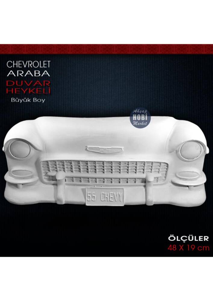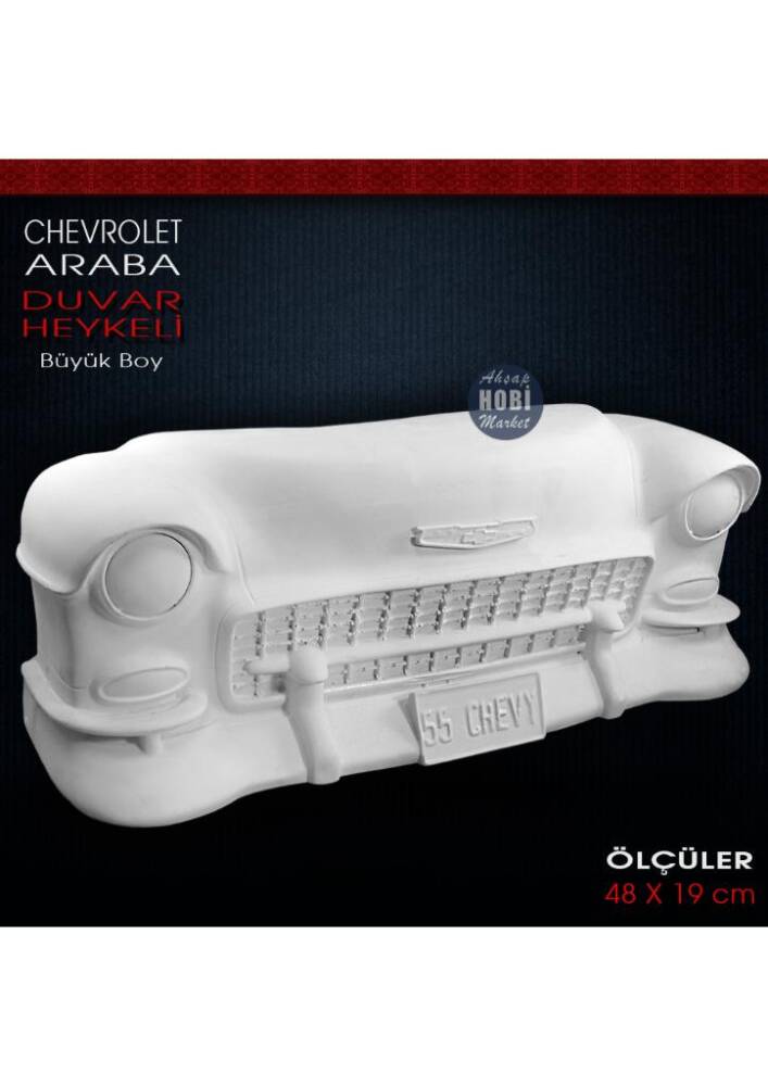 Polyester Duvar Modeli Chevrolet Araba Heykeli, 19 cm yüksekliğinde, 48 cm genişliğinde, 15 cm derinliğinde, üç boyutlu bir aksesuar objedir. İstenirse üzerine yarım oval cam kestirilerek biblo rafı olarak da kullanılabilir.