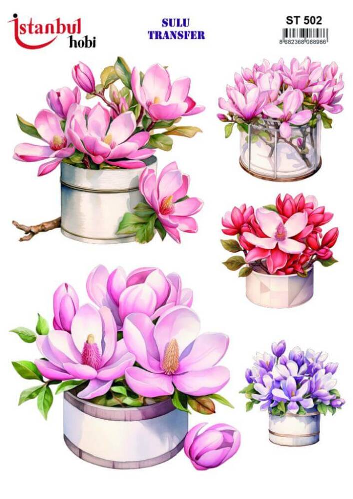 Sulu Transfer Kağıdı model STİ -502, her türlü hobi projesinde kullanılabilen, kendinden yapışkanlı, yapıştırıldığı yüzeyde hava kabarcığı bırakmayan, birinci kalite transfer kağıdıdır. Transfer Kağıtlarının üzerlerindeki desenler, kullanıldığı ürünün görkemli ve üst düzey gözükmesini sağlamaktadır.