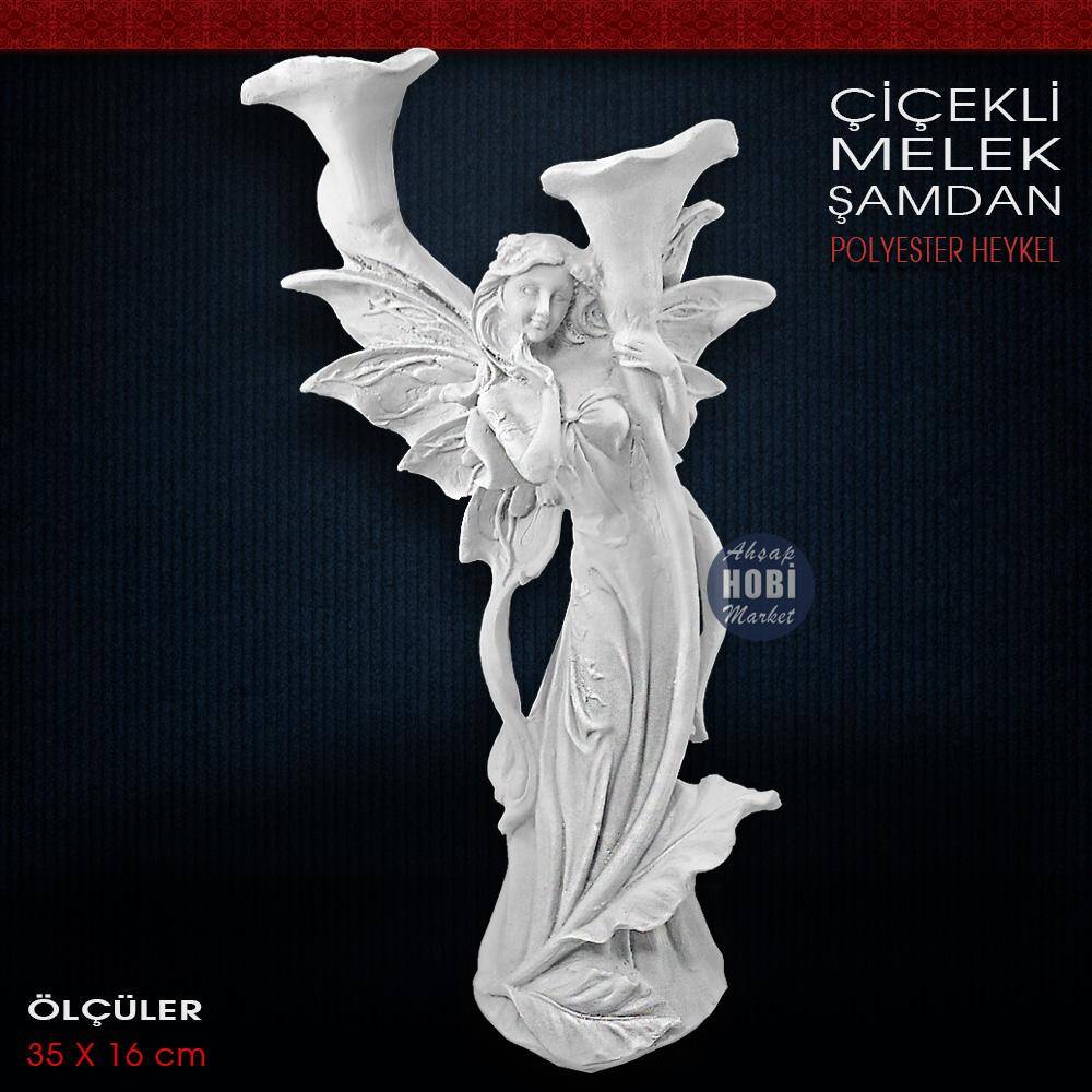 Polyester Çiçekli Melek Şamdan 35 cm yükseklik 16 cm genişlik, 13 cm derinlik ölçüsüne sahiptir. Üstüne 2 cm çapına kadar mum koyabilirsiniz. Şamdanda 2 adet mum koyma yeri bulunmaktadır.