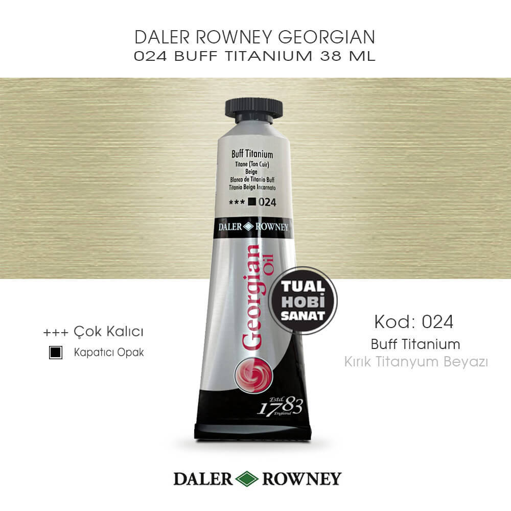 Daler Rowney Georgian Yağlı Boyalar, 24 tek pigment renginde, 31 opak ve yarı opak renginde toplam 54 renk seçeneği ile satışa sunulmaktadır. Tüm renkler keskin fırça darbelerine imkan vermekle birlikte spatula veya fırçalar ile rahatlıkla kullanılabilir. Boyalar kururken renk tonlarında değişiklik olmaz. Kremimsi yapıda olan Georgian Buff Titanium Yağlı Boyaları, kullanım amacınıza bağlı olarak kokusuz terebentin veya keten yağı ile kolayca inceltebilirsiniz.