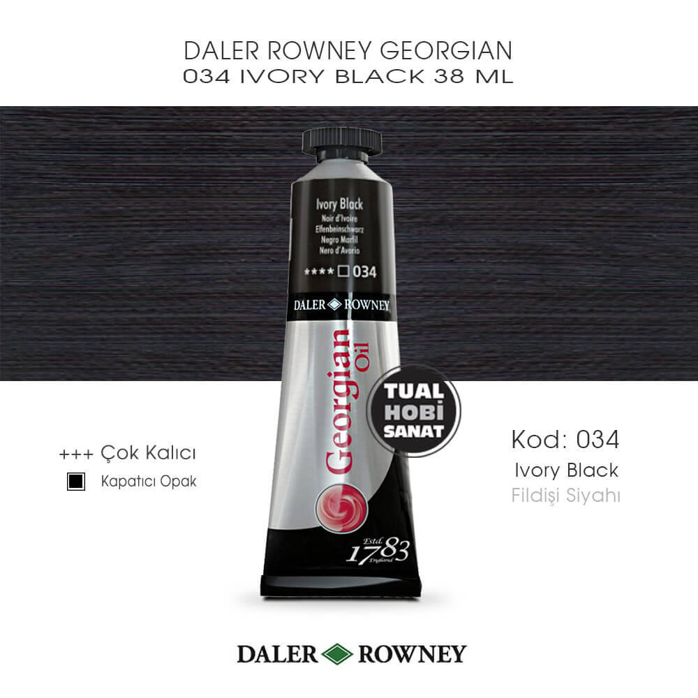 Ivory Black rengi Georgian yağlı boyalar, pürüzsüz parlak yüzeyli, örtücülük, kalıcılık ve doygunluk konusunda üst segment, yıllar boyunca sararma ve solma yapmayan, çok hızlı kuruma yapmayan dolayısıyla resim üzerinde ressama yeteri kadar çalışma zamanı tanıyan, resim bittiğinde özel sprey verniklerle kolaylıkla koruma sağlayabileceğiniz, tüm renklerin birbiri ile karıştırılabilip istediğiniz tonlara kolayca ulaşabileceğiniz kaliteli boyalardır.