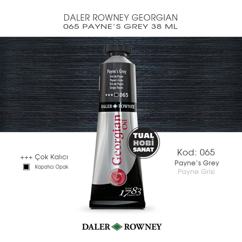 Paynes Grey rengi Georgian yağlı boyalar, pürüzsüz parlak yüzeyli, örtücülük, kalıcılık ve doygunluk konusunda üst segment, yıllar boyunca sararma ve solma yapmayan, çok hızlı kuruma yapmayan dolayısıyla resim üzerinde ressama yeteri kadar çalışma zamanı tanıyan, resim bittiğinde özel sprey verniklerle kolaylıkla koruma sağlayabileceğiniz, tüm renklerin birbiri ile karıştırılabilip istediğiniz tonlara kolayca ulaşabileceğiniz kaliteli boyalardır.