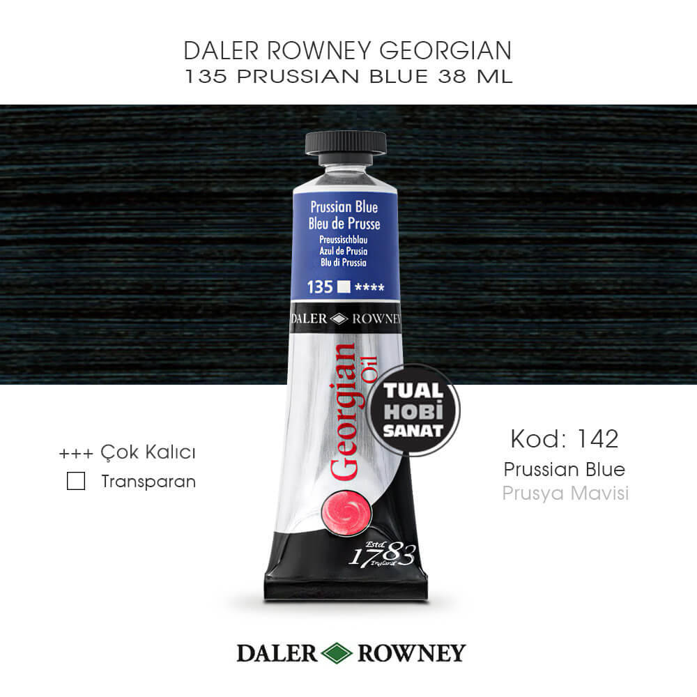 Prussian Blue rengi Georgian yağlı boyalar, pürüzsüz parlak yüzeyli, örtücülük, kalıcılık ve doygunluk konusunda üst segment, yıllar boyunca sararma ve solma yapmayan, çok hızlı kuruma yapmayan dolayısıyla resim üzerinde ressama yeteri kadar çalışma zamanı tanıyan, resim bittiğinde özel sprey verniklerle kolaylıkla koruma sağlayabileceğiniz, tüm renklerin birbiri ile karıştırılabilip istediğiniz tonlara kolayca ulaşabileceğiniz kaliteli boyalardır.