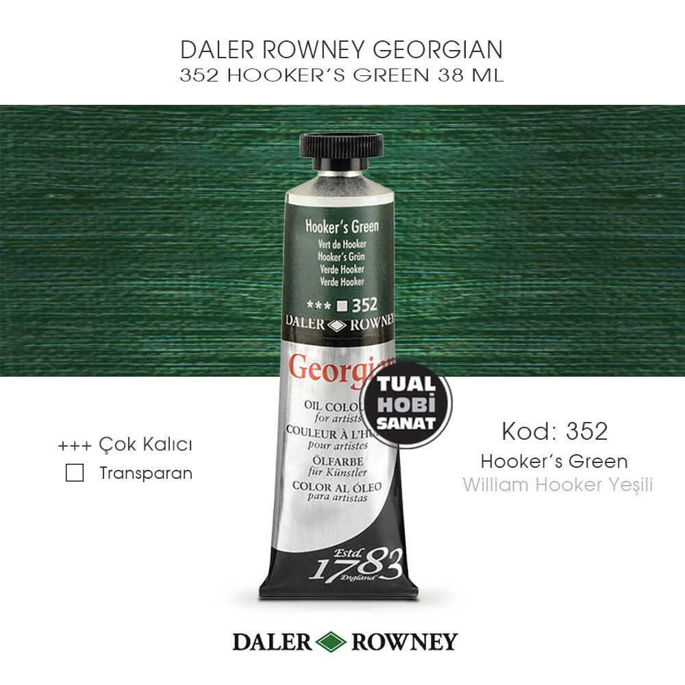 Daler Rowney Georgian Yağlı Boyalar, 24 tek pigment renginde, 31 opak ve yarı opak renginde toplam 54 renk seçeneği ile satışa sunulmaktadır. Tüm renkler keskin fırça darbelerine imkan vermekle birlikte spatula veya fırçalar ile rahatlıkla kullanılabilir. Boyalar kururken renk tonlarında değişiklik olmaz. Kremimsi yapıda olan Georgian Hooker Yeşili Yağlı Boyaları, kullanım amacınıza bağlı olarak kokusuz terebentin veya keten yağı ile kolayca inceltebilirsiniz.