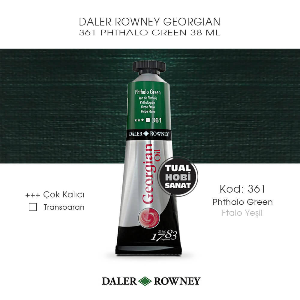 Daler Rowney Georgian Yağlı Boyalar, 24 tek pigment renginde, 31 opak ve yarı opak renginde toplam 54 renk seçeneği ile satışa sunulmaktadır. Tüm renkler keskin fırça darbelerine imkan vermekle birlikte spatula veya fırçalar ile rahatlıkla kullanılabilir. Boyalar kururken renk tonlarında değişiklik olmaz. Kremimsi yapıda olan Georgian Ftalo Yeşili Yağlı Boyaları, kullanım amacınıza bağlı olarak kokusuz terebentin veya keten yağı ile kolayca inceltebilirsiniz.