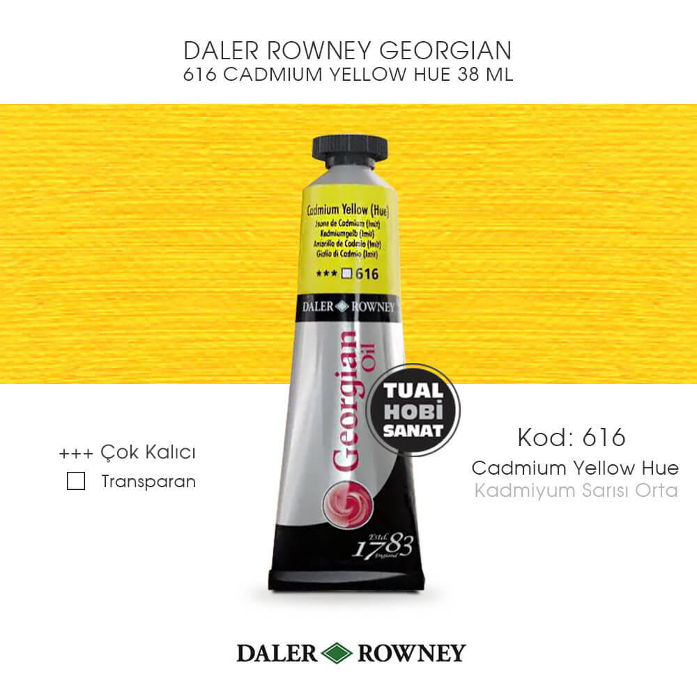Cadmium Yellow Hue rengi Georgian yağlı boyalar, pürüzsüz parlak yüzeyli, örtücülük, kalıcılık ve doygunluk konusunda üst segment, yıllar boyunca sararma ve solma yapmayan, çok hızlı kuruma yapmayan dolayısıyla resim üzerinde ressama yeteri kadar çalışma zamanı tanıyan, resim bittiğinde özel sprey verniklerle kolaylıkla koruma sağlayabileceğiniz, tüm renklerin birbiri ile karıştırılabilip istediğiniz tonlara kolayca ulaşabileceğiniz kaliteli boyalardır.