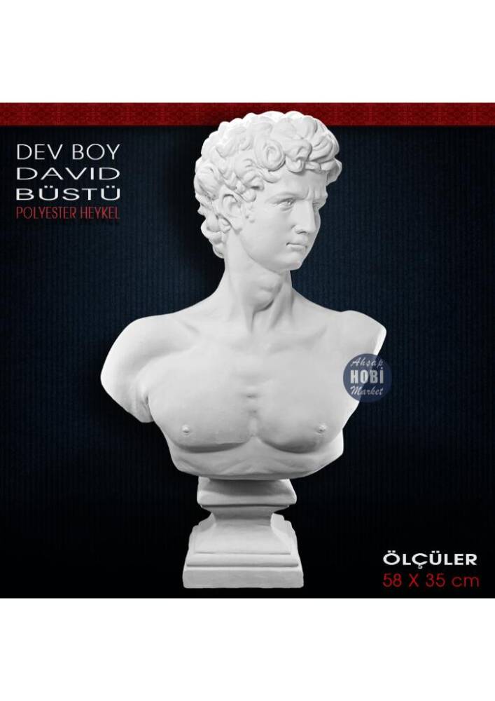 Polyester Dev Boy David Heykeli, birinci kalite polyester hammaddesinden özel makinalarda dökülmüş, klasik, modern, pop-art, gotik başta olmak üzere her tür dekorasyon trendine uygun olarak boyanabilecek, hatasız, mükemmel detaylı, ağır, tok görünümlü polyester aksesuar objedir. Taş tozundan veya silikon kalıba dökülerek yapılan objelerden değildir. Ağır ve tok bir görünüme sahiptir. Modası asla geçmeyecek, zamansız trend bir üründür.