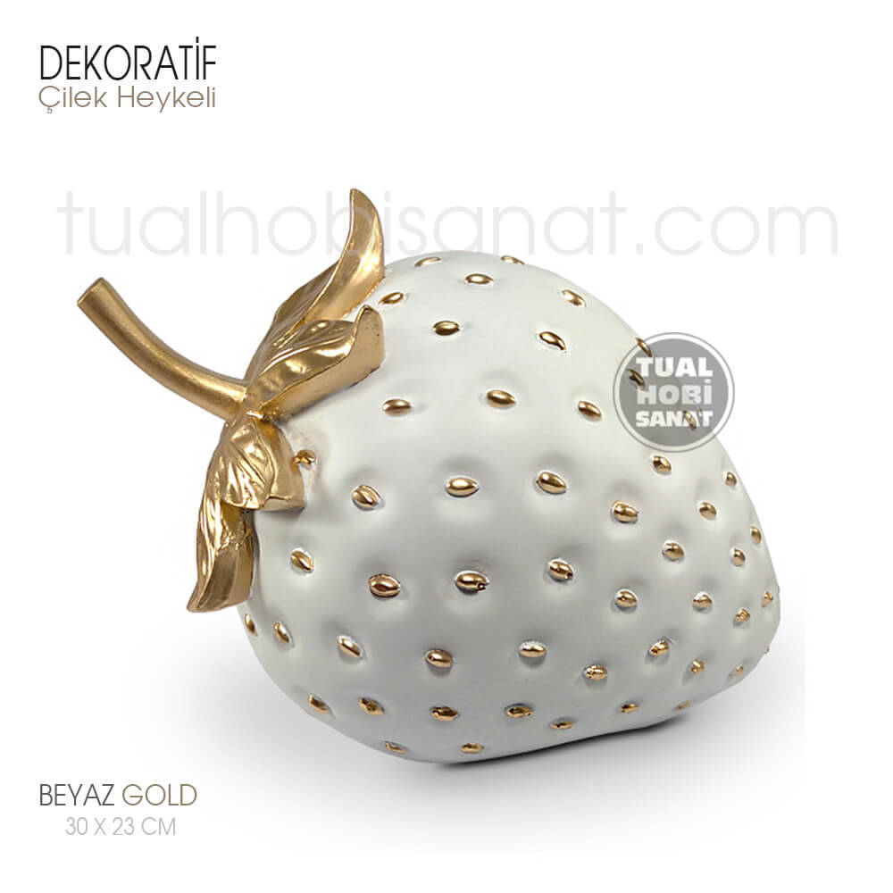 Dekoratif Çilek Heykeli, 23 cm yüksekliğinde, 30 cm genişliğinde, 20 cm derinliğinde, üç boyutlu dekor amaçlı kullanılan bir aksesuar objedir. Ürün opak beyaz ve metalik gold renklerine boyanmıştır.
