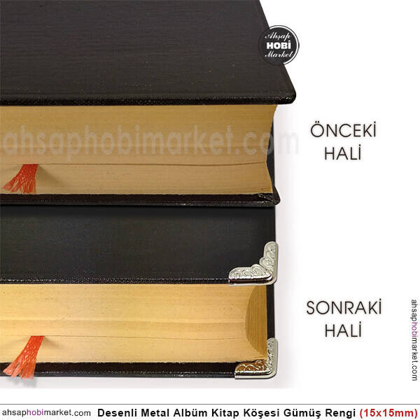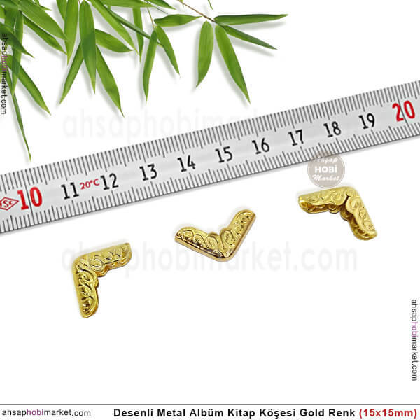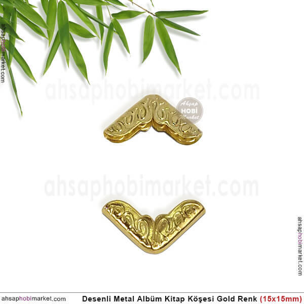 Metal Albüm ve Kitap Köşeleri Gold Renkli kaliteli metalden üretilmiş sarı nikel ile kaplanmış olup, 15 mm yüksekliğe, 15 mm genişliğe sahiptir. Kitap kapağının girdiği ara ölçüsü 3-3,5 mm boyutundadır.