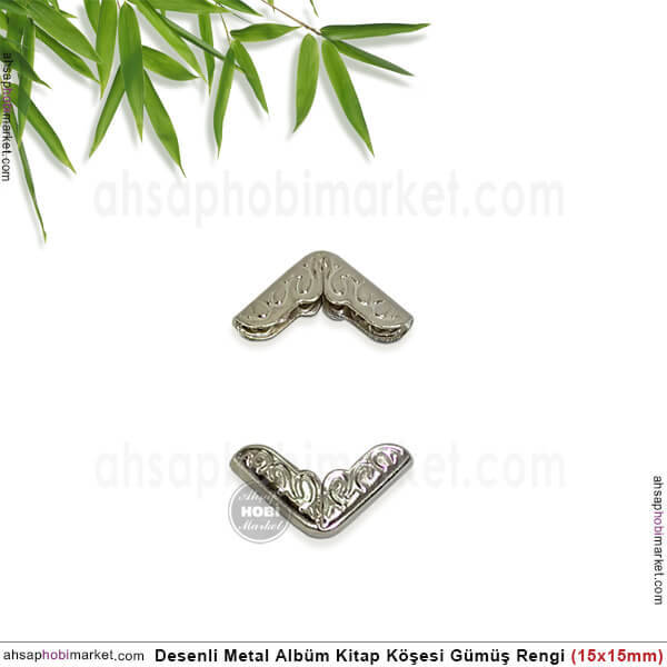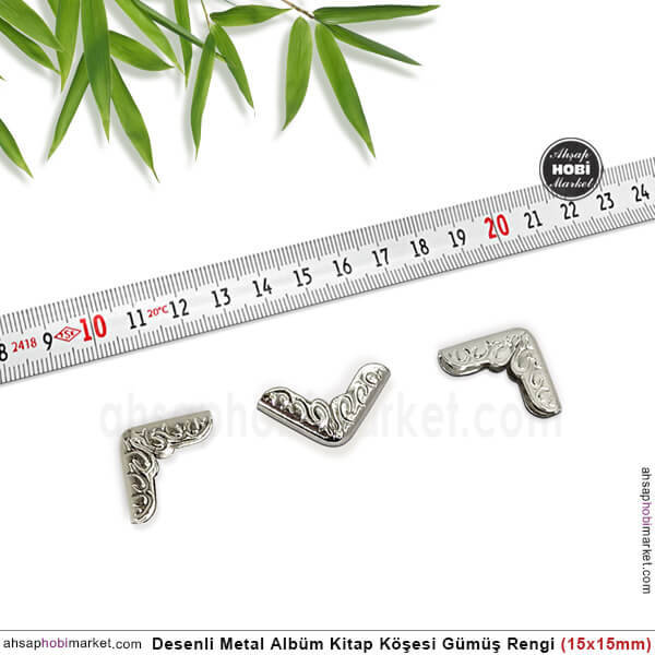 Metal Albüm ve Kitap Köşeleri Gümüş Renkli kaliteli metalden üretilmiş nikel ile kaplanmış olup, 15 mm yüksekliğe, 15 mm genişliğe sahiptir. Kitap kapağının girdiği ara ölçüsü 3-3,5 mm boyutundadır.