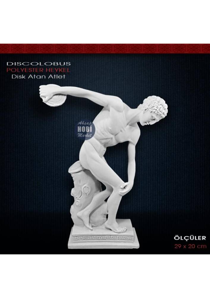 Polyester Disk Atan Atlet Discolobus Heykeli, birinci kalite polyester hammaddesinden özel makinalarda dökülmüş, klasik, modern, rustik başta olmak üzere her tür dekorasyon trendine uygun olarak boyanabilecek, hatasız, pürüzlü detaylı, metal ayaklı, ağır tok görünümlü polyester aksesuar objedir. Taş tozundan veya silikon kalıba dökülerek yapılan objelerden değildir. Ağır ve tok bir görünüme sahiptir. Modası asla geçmeyecek trend bir üründür.