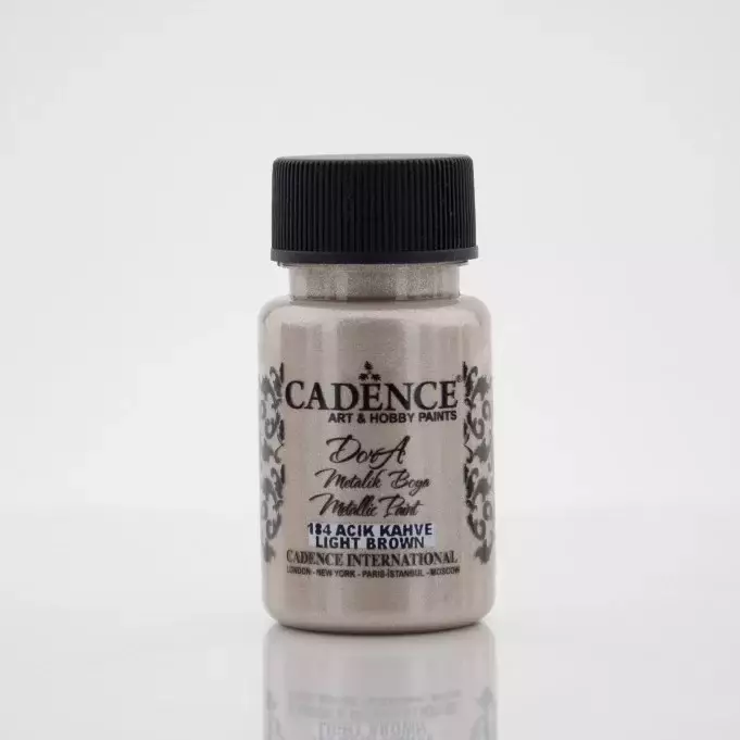 Cadence Dora Metalik Açık Kahverengi, içerisinde bulunan sedef sayesinde kullanıldığı yüzeylerde metalik görünüm sağlayan, kullanıma hazır, su bazlı, üstün kapatıcılık seviyesine sahip akrilik boyadır. Cadence Dora Serisi boyalar içerisinde sağlığa zararlı toksik maddeler bulundurmayan, her yaşta hobi meraklısının ve profesyonelin güvenle kullanabileceği dekoratif amaçlı su bazlı akrilik boyadır.