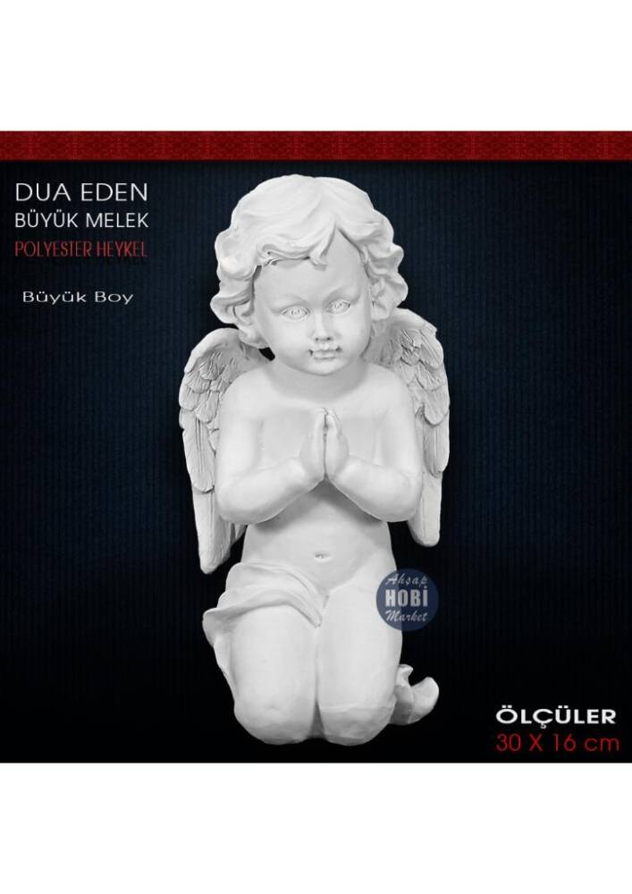 Polyester Dua Eden Büyük Melek Heykeli, 16 cm genişliğe, 30 cm yüksekliğe ve 14 cm derinliğe sahip, 3 boyutlu yaklaşık 1 kg ağırlığında, tok görünümlü dekoratif heykel biblodur.