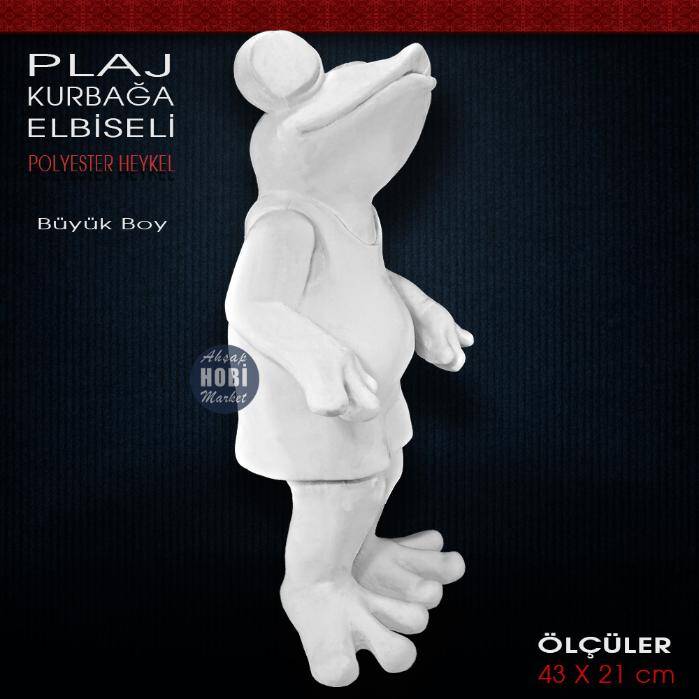 Polyester Plaj Kurbağası Elbiseli Modeli, birinci kalite polyesterden, 3 boyutlu olarak özel makinalarda dökülmüş, avangarde, otantik, pop art ve klasik başta olmak üzere her tür dekorasyon trendine uygun olarak boyanabilecek, hatasız ve mükemmel detaylı, tok görünümlü, polyester aksesuar objedir. Taş tozundan veya silikon kalıba dökülerek yapılan objelerden değildir. Ağır ve tok bir görünüme sahiptir.