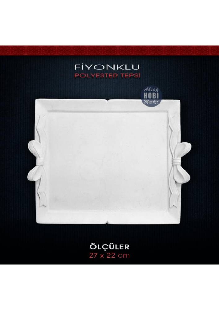 Ham polyester fiyonklu tepsi, 27 cm genişliğinde, 22 cm eninde ve en kalın noktası zeminden 3 cm yükseklikte, %100 ham polyesterden üretilmiş içi dolu ve her türlü boyaya uygun işlevsel polyester objedir.