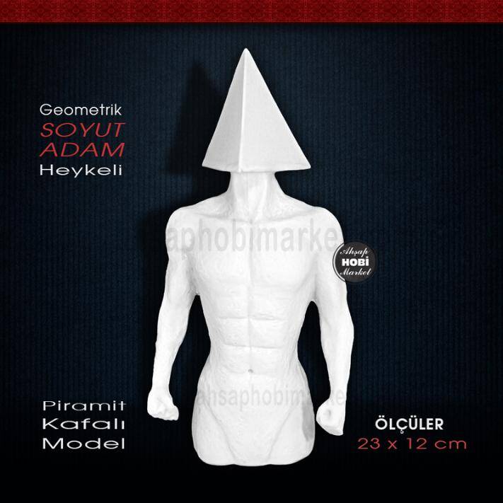 Polyester Piramit Kafalı Geometrik Adam Biblo Heykeli, 23 cm yüksekliğinde, 12 cm genişliğinde, 7cm derinliğinde üç boyutlu, soyut modern bir dekoratif aksesuar objedir. İçi dolu polyesterden üretilmiş ağır ve dayanıklı bir biblo heykeldir.
