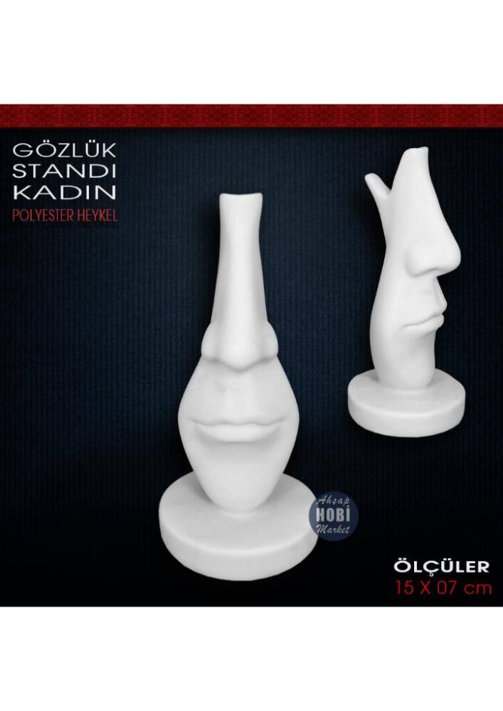 Polyester Gözlük Standı Kadın Model, 15 cm yüksekliğinde, 7 cm genişliğinde ve 7 cm derinliğinde 3 boyutlu bir aksesuar heykel objedir.