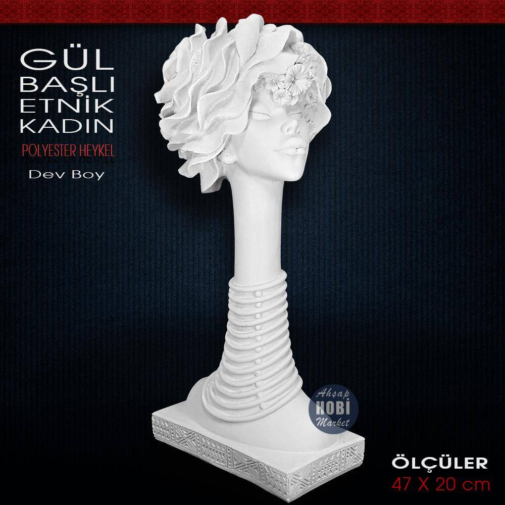 Polyester Gül Kafalı Etnik Kadın Heykeli, 48 cm yüksekliğinde, 20 cm genişliğinde, 18 cm derinliğinde üç boyutlu bir aksesuar Heykel Biblo objedir.