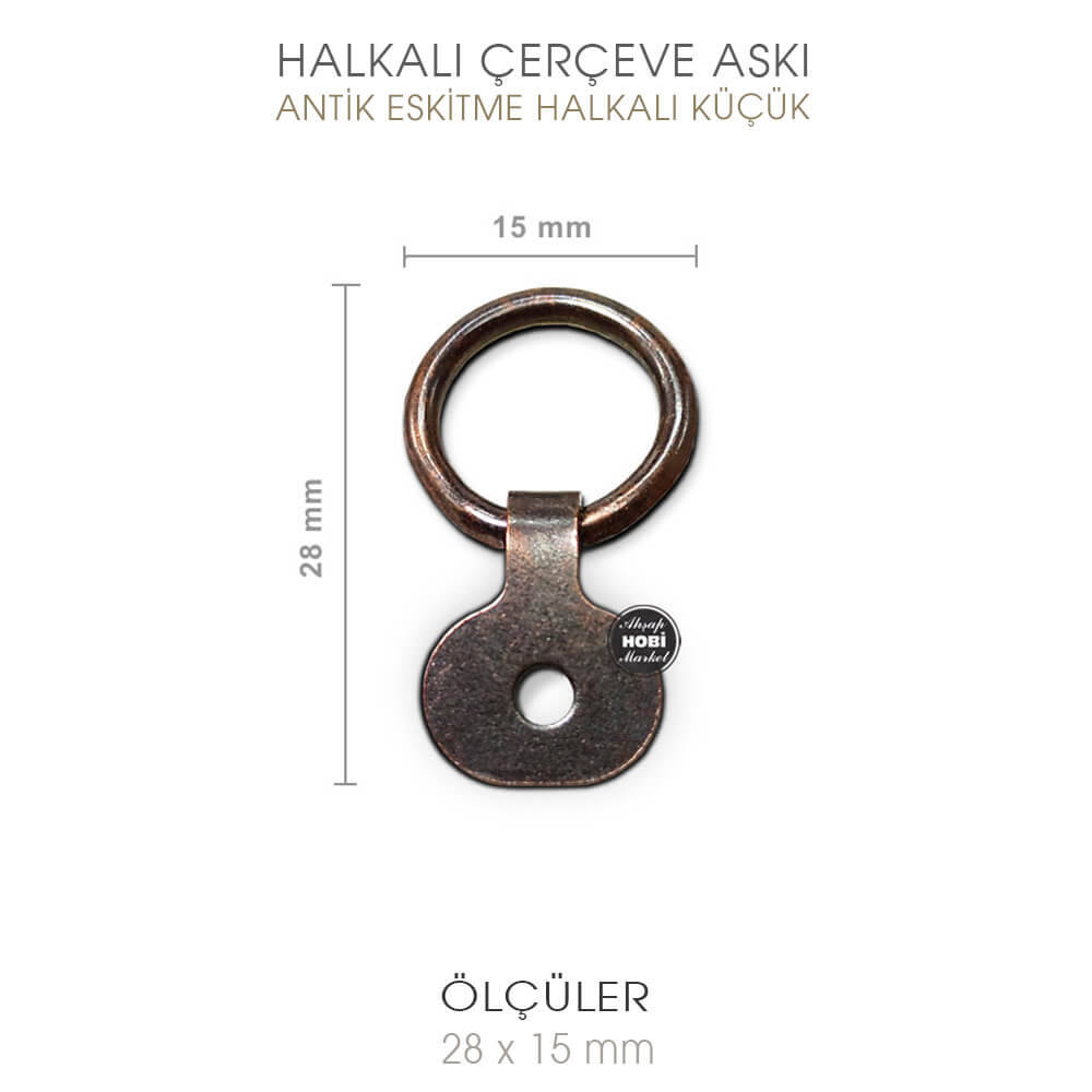 Kaliteli çerçeve ve duvar panolarınızı duvara asarken bazen rustik bir görünüm vermesi için askı aparatının gözükmesi istenir. Halka kısmı bu amaçla üstte ve dışarda kalıp bu görünümü vermektedir. Halkalı Çerçeve Askısının Uzunluğu 2,8 cm, halka kısmı genişliği 1,5 cm, vida deliği çapı ise 3 mm boyutundadır.