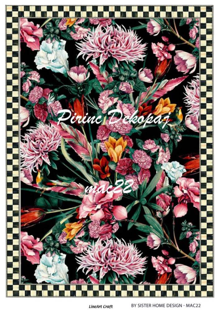 LineArt Çiçek Desenli Pirinç Dekopaj - Model : mac22 , pirinç çeltiğinden üretilmiş, her türlü hobi projesinde kullanılabilen, dekopaj tutkalı ile yapıştırılabilen, yapıştırıldığı yüzeyde hava kabarcığı bırakmayan, birinci kalite dekopaj kağıdıdır. Pirinç Dekopajların üzerleindeki desenler, kullanıldığı ürünün görkemli ve üst düzey gözükmesini sağlamaktadır.