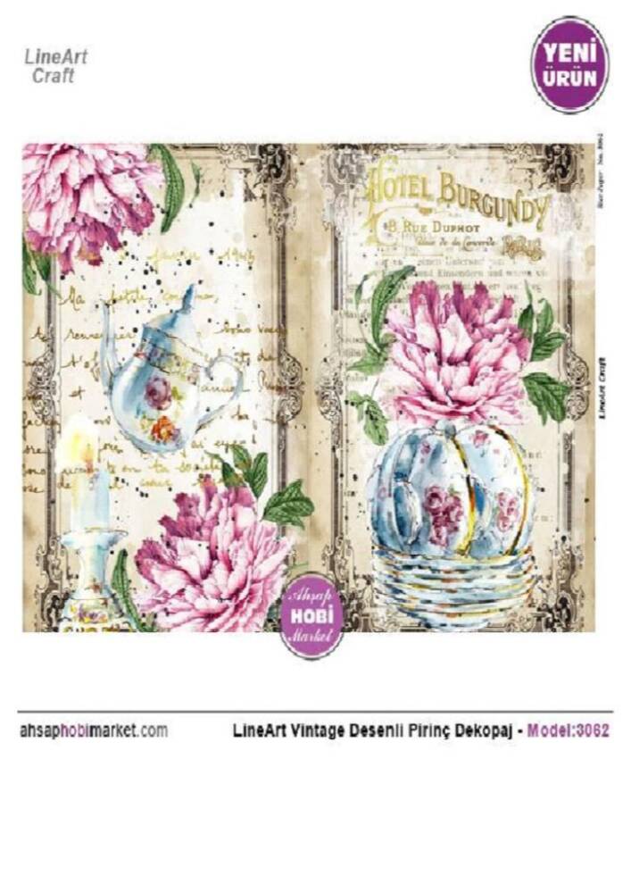 LineArt Vintage Desenli Pirinç Dekopaj, pirinç çeltiğinden üretilmiş, her türlü hobi projesinde kullanılabilen, dekopaj tutkalı ile yapıştırılabilen, yapıştırıldığı yüzeyde hava kabarcığı bırakmayan, birinci kalite dekopaj kağıdıdır. Pirinç Dekopajların üzerleindeki desenler, kullanıldığı ürünün görkemli ve üst düzey gözükmesini sağlamaktadır.
