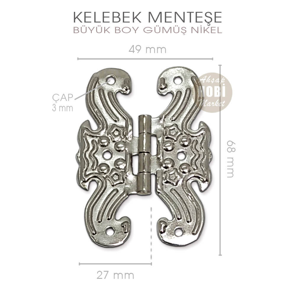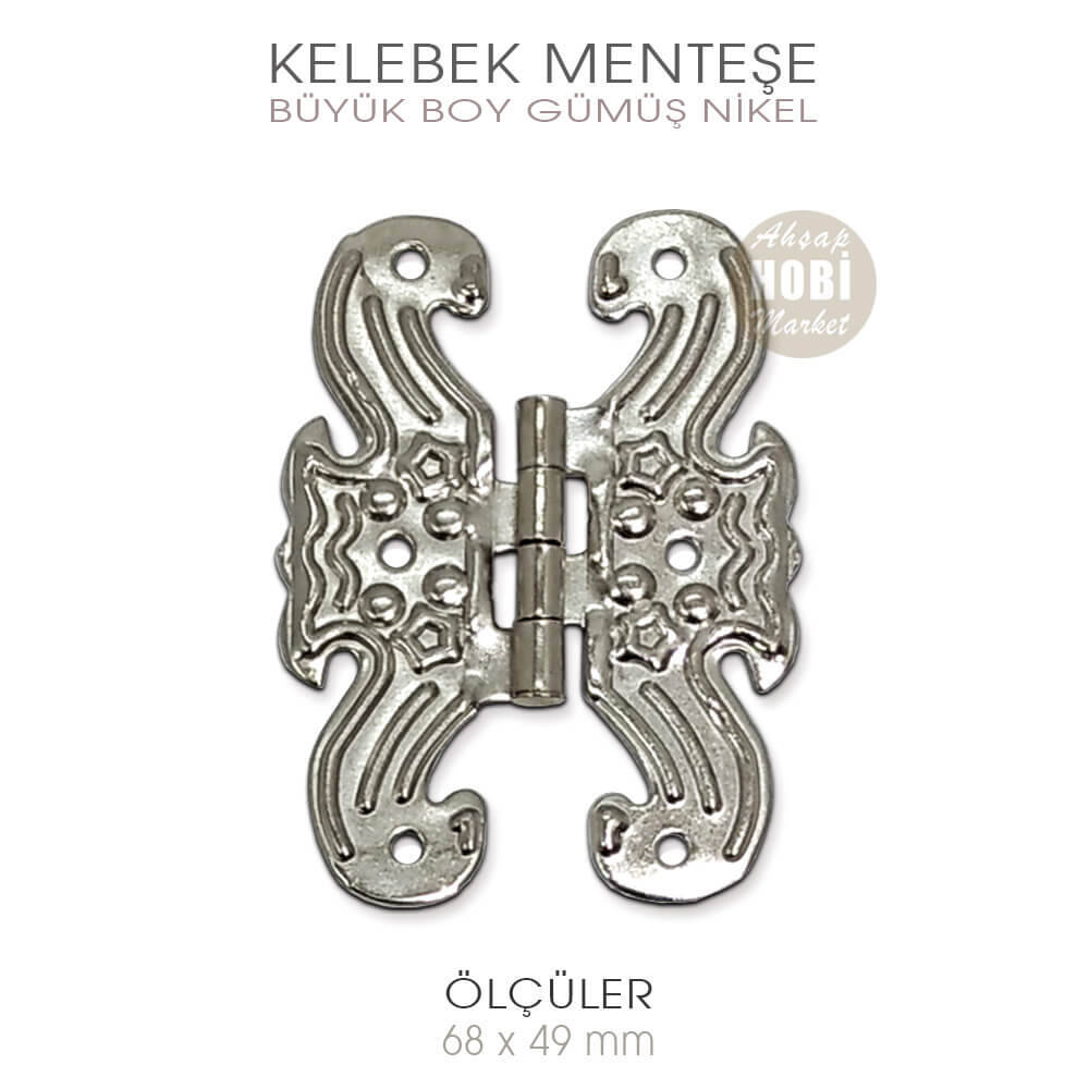 Büyük Kelebek Menteşeler kaliteli metal sactan üretilmiş olup üzerlerine Gümüş Renkli Nikel Kaplama işlemi uygulanmıştır. Büyük boy kelebek menteşeler 6,8 cm yüksekliğe, 4,9 cm genişliğe sahip olup, vida deliklerinin çapı 3 mm dir.