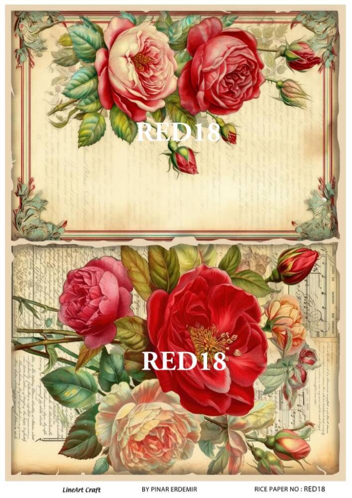 LineArt Kırmızı Gül Desenli Pirinç Dekopaj - Model : RED 18, pirinç çeltiğinden üretilmiş, her türlü hobi projesinde kullanılabilen, dekopaj tutkalı ile yapıştırılabilen, yapıştırıldığı yüzeyde hava kabarcığı bırakmayan, birinci kalite dekopaj kağıdıdır. Pirinç Dekopajların üzerleindeki desenler, kullanıldığı ürünün görkemli ve üst düzey gözükmesini sağlamaktadır.