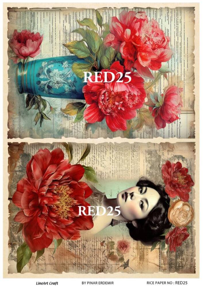 LineArt Kırmızı Gül Desenli Pirinç Dekopaj - Model : RED 25, pirinç çeltiğinden üretilmiş, her türlü hobi projesinde kullanılabilen, dekopaj tutkalı ile yapıştırılabilen, yapıştırıldığı yüzeyde hava kabarcığı bırakmayan, birinci kalite dekopaj kağıdıdır. Pirinç Dekopajların üzerleindeki desenler, kullanıldığı ürünün görkemli ve üst düzey gözükmesini sağlamaktadır.