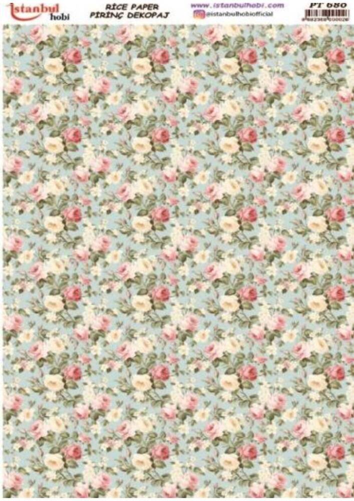 Küçük Çiçek Desenli Pirinç Dekopaj - Model : PT 00680, pirinç çeltiğinden üretilmiş, her türlü hobi projesinde kullanılabilen, dekopaj tutkalı ile yapıştırılabilen, yapıştırıldığı yüzeyde hava kabarcığı bırakmayan, birinci kalite dekopaj kağıdıdır. Pirinç Dekopajların üzerleindeki desenler, kullanıldığı ürünün görkemli ve üst düzey gözükmesini sağlamaktadır.