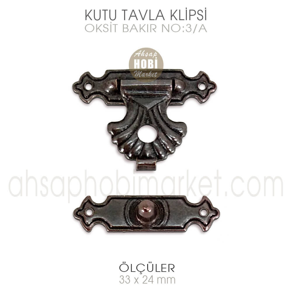 Gelince Haber VerKutu Tavla Klipsi No 3A, her türlü düz kutu, tavla kutusu, küçük sandık, vip kutu, dekoratif ahşap boyama kutusu, tesbih kutusu gibi objelerde kapağı sabitlemek amacıyla kullanılan, vidalayarak montajlanan, uygulandığı objeye görkemli bir hava katarken, kutu kapağının da açılmasını engelleyen, fiziksel eskitme ile antik bakır rengi görünüm verilmiş bir metal klips aksesuardır.