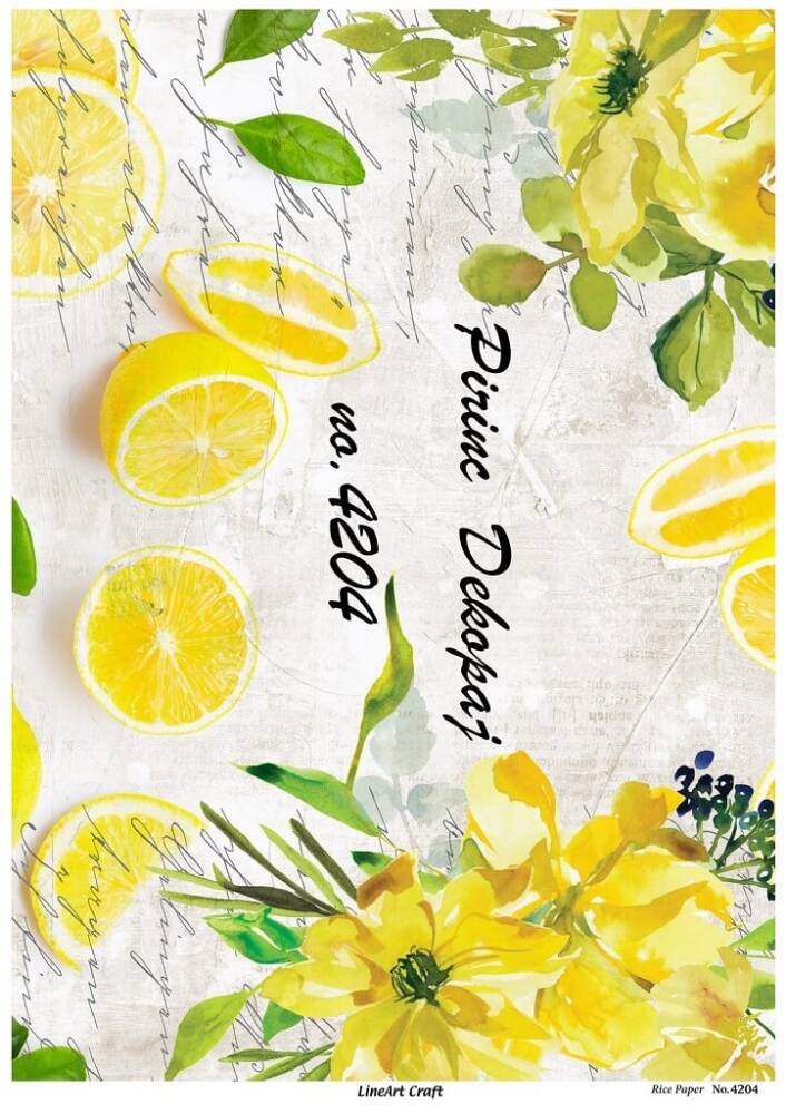 LineArt Limon Desenli Pirinç Dekopaj - Model : 4206 , pirinç çeltiğinden üretilmiş, her türlü hobi projesinde kullanılabilen, dekopaj tutkalı ile yapıştırılabilen, yapıştırıldığı yüzeyde hava kabarcığı bırakmayan, birinci kalite dekopaj kağıdıdır. Pirinç Dekopajların üzerleindeki desenler, kullanıldığı ürünün görkemli ve üst düzey gözükmesini sağlamaktadır.