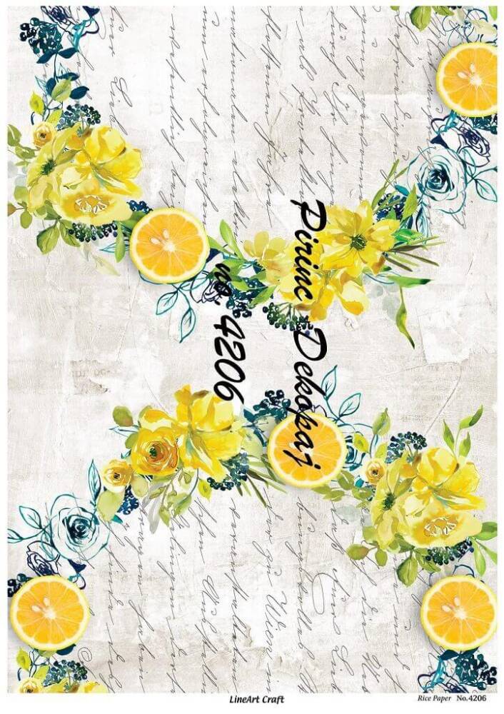LineArt Limon Desenli Pirinç Dekopaj - Model : 4206, pirinç çeltiğinden üretilmiş, her türlü hobi projesinde kullanılabilen, dekopaj tutkalı ile yapıştırılabilen, yapıştırıldığı yüzeyde hava kabarcığı bırakmayan, birinci kalite dekopaj kağıdıdır. Pirinç Dekopajların üzerleindeki desenler, kullanıldığı ürünün görkemli ve üst düzey gözükmesini sağlamaktadır.