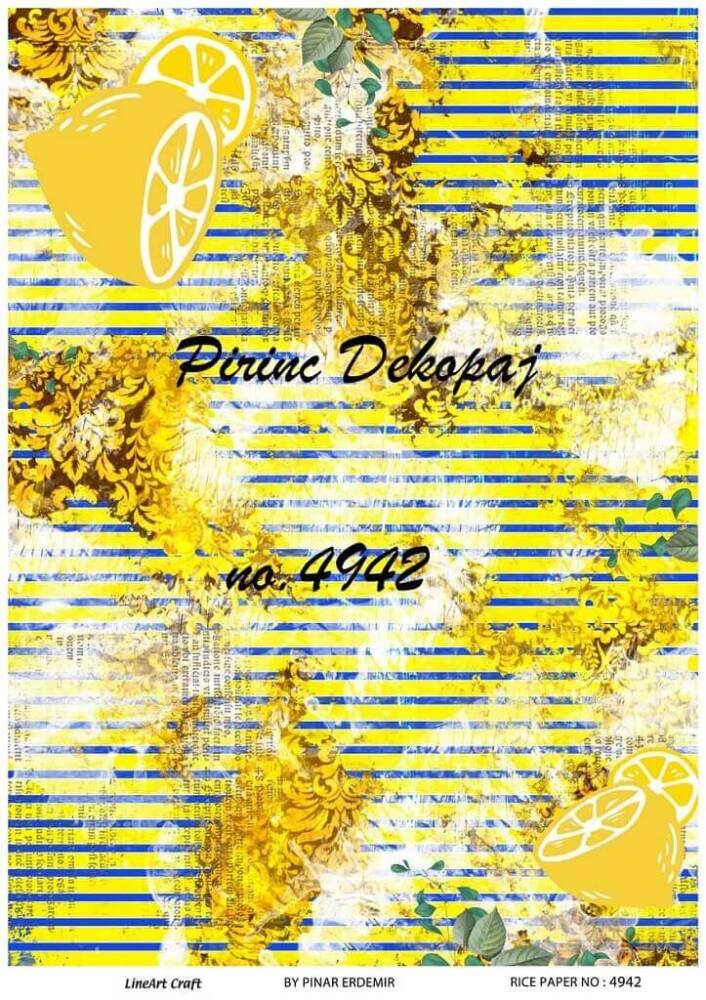LineArt Limon Desenli Pirinç Dekopaj, pirinç çeltiğinden üretilmiş, her türlü hobi projesinde kullanılabilen, dekopaj tutkalı ile yapıştırılabilen, yapıştırıldığı yüzeyde hava kabarcığı bırakmayan, birinci kalite dekopaj kağıdıdır. Pirinç Dekopajların üzerleindeki desenler, kullanıldığı ürünün görkemli ve üst düzey gözükmesini sağlamaktadır.
