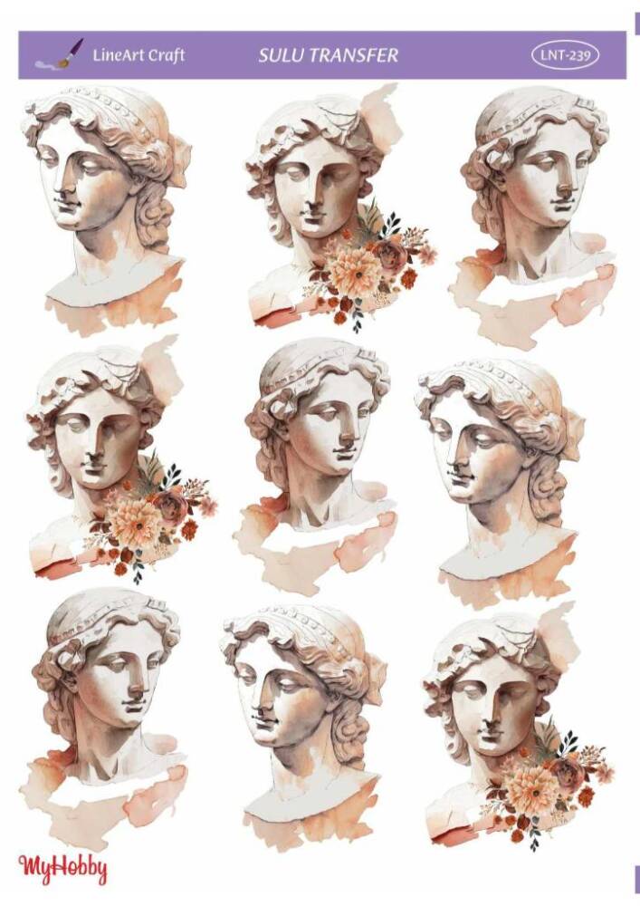 Sulu Transfer Kağıdı model LNT - 239 her türlü hobi projesinde kullanılabilen, kendinden yapışkanlı, yapıştırıldığı yüzeyde hava kabarcığı bırakmayan, birinci kalite transfer kağıdıdır. Transfer Kağıtlarının üzerlerindeki desenler, kullanıldığı ürünün görkemli ve üst düzey gözükmesini sağlamaktadır.