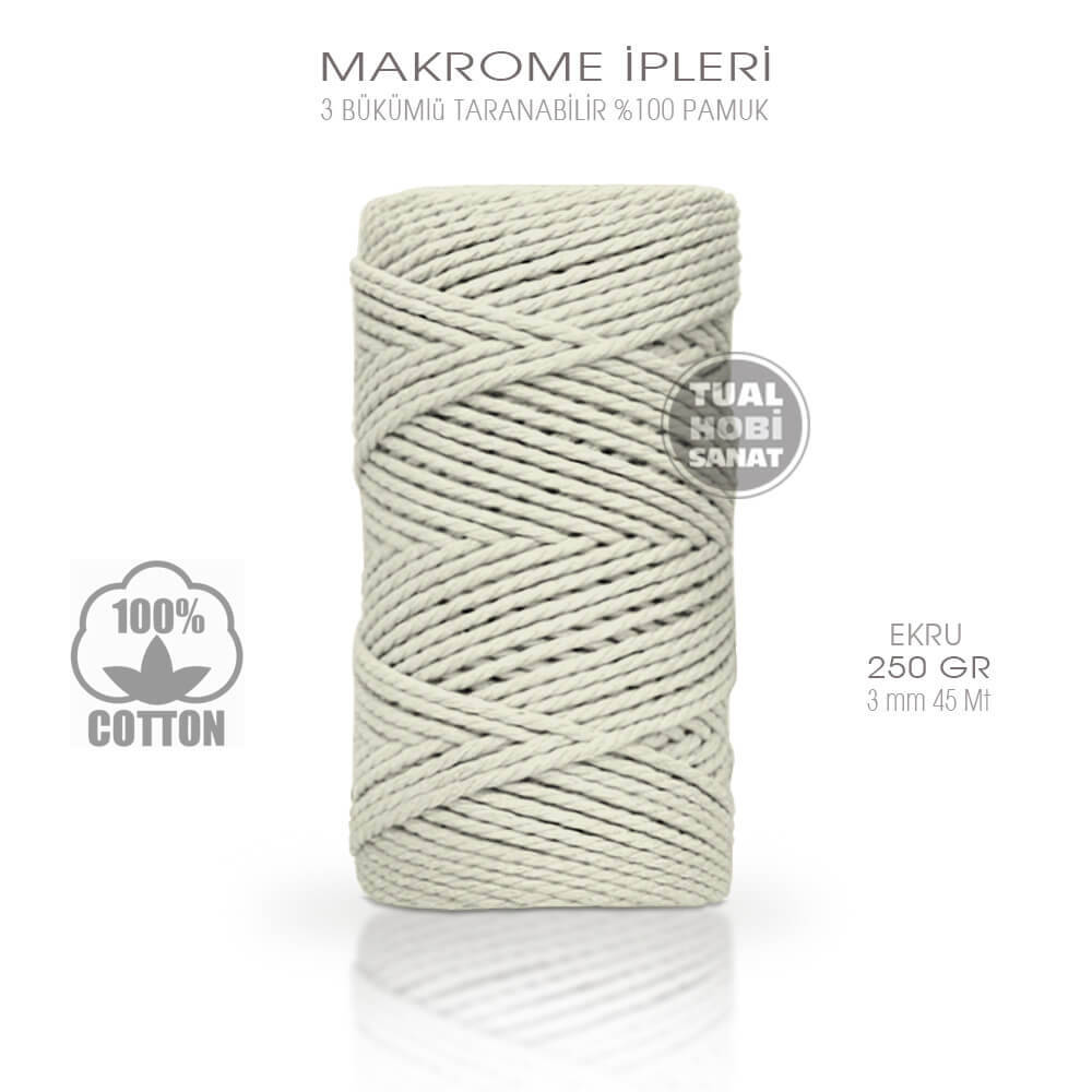 Gelince Haber VerBükümlü pamuk ekru rengi makrome ipleri, %100 geri dönüştürülmüş pamuk iplikten, tamamen yerli üretim olup, 3-4 mm kalınlığında, 250 gr, 40-45 metre uzunluğunda makrome örgü ipleridir. Özellikle makrome, dekoratif sepet, anahtarlık ve çanta yapımı ile amigurumi oyuncak yapımına uygun olup, solmayan canlı ve doğal renkleriyle harika ürünler elde edeceğiniz doğal iplerdir. Makrome iplerimiz yerli üretim olup, sınıfında üst kaliteye sahiptir.