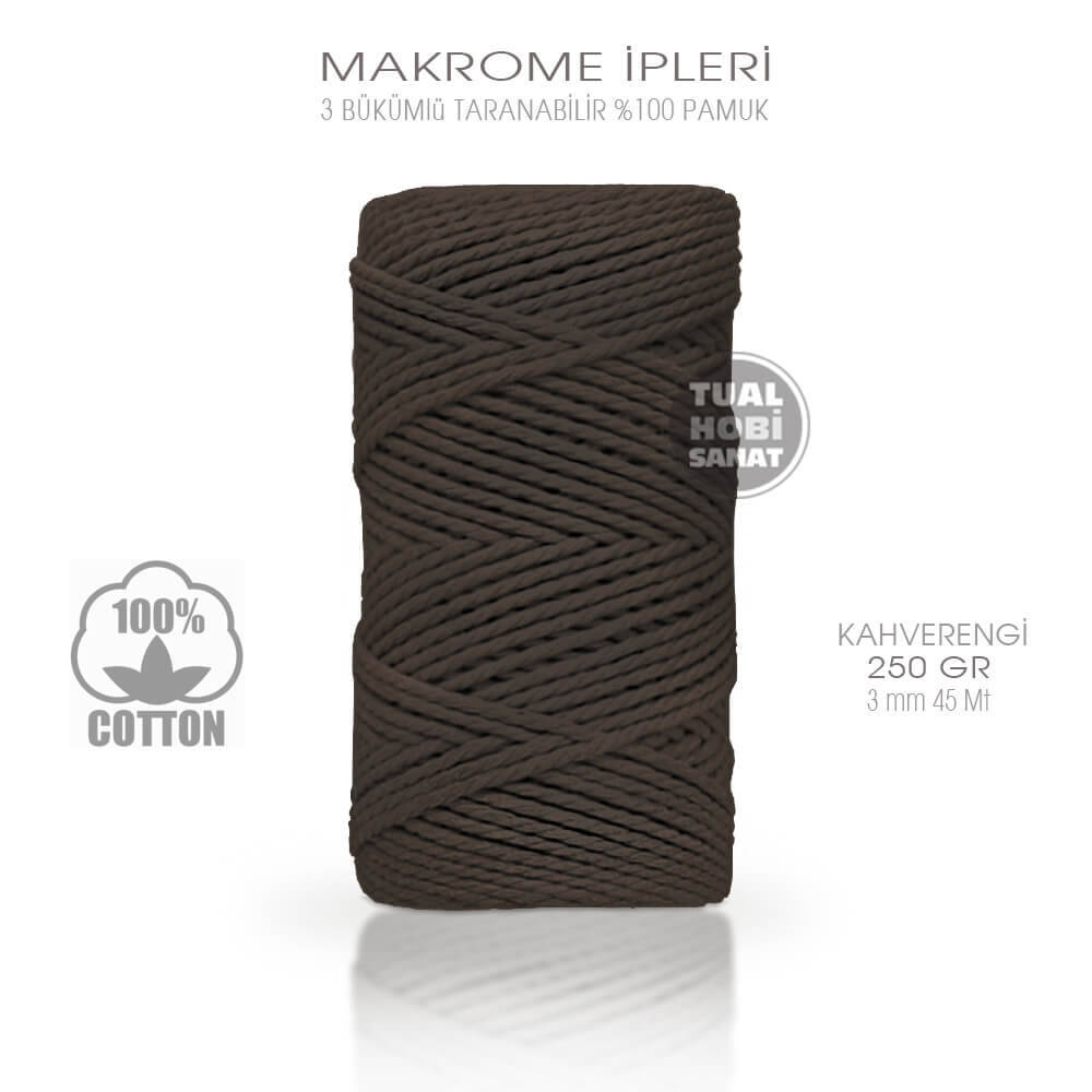 Gelince Haber VerBükümlü pamuk kahverengi makrome ipleri, %100 geri dönüştürülmüş pamuk iplikten, tamamen yerli üretim olup, 3-4 mm kalınlığında, 250 gr, 40-45 metre uzunluğunda makrome örgü ipleridir. Özellikle makrome, dekoratif sepet, anahtarlık ve çanta yapımı ile amigurumi oyuncak yapımına uygun olup, solmayan canlı ve doğal renkleriyle harika ürünler elde edeceğiniz doğal iplerdir. Makrome iplerimiz yerli üretim olup, sınıfında üst kaliteye sahiptir.