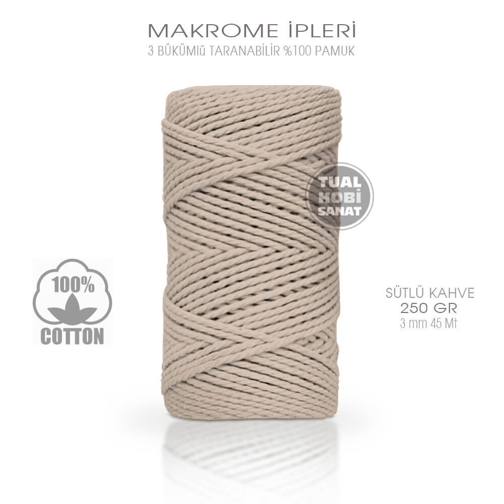 Gelince Haber VerBükümlü pamuk sütlü kahve rengi makrome ipleri, %100 geri dönüştürülmüş pamuk iplikten, tamamen yerli üretim olup, 3-4 mm kalınlığında, 250 gr, 40-45 metre uzunluğunda makrome örgü ipleridir. Özellikle makrome, dekoratif sepet, anahtarlık ve çanta yapımı ile amigurumi oyuncak yapımına uygun olup, solmayan canlı ve doğal renkleriyle harika ürünler elde edeceğiniz doğal iplerdir. Makrome iplerimiz yerli üretim olup, sınıfında üst kaliteye sahiptir.