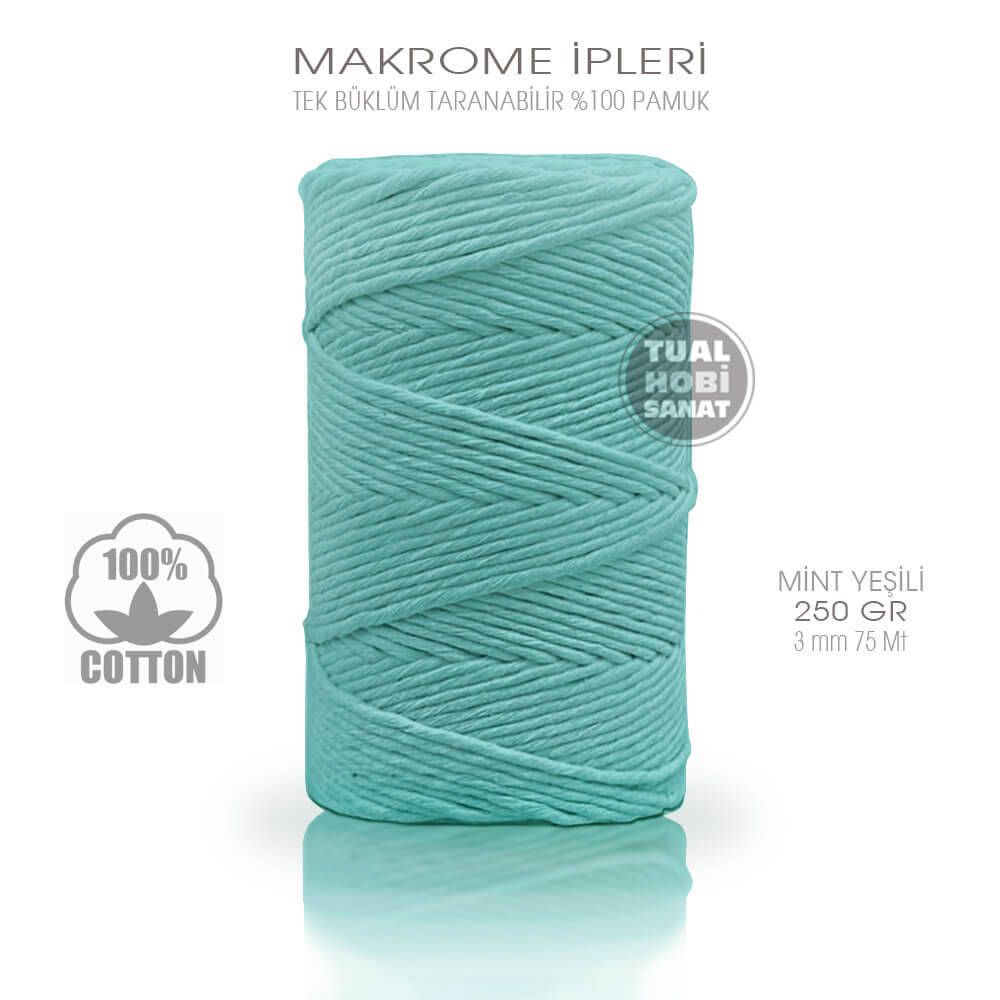 Gelince Haber VerBükümsüz, tek büklüm taranabilir mint nane yeşili makrome ipleri, %100 geri dönüştürülmüş pamuk hammaddesinden, tamamen yerli üretim olup, ipler 3 mm kalınlığında, 250 gr ağırlığında ve yaklaşık 75 metre uzunluğunda niteliklere sahiptir. Özellikle duvar makrome yapımı, çanta yapımı, anahtarlık yapımı ve amigurumi oyuncak yapımına uygun olup, solmayan canlı ve doğal renkleriyle harika ürünler elde edeceğiniz doğal iplerdir. Makrome iplerimiz yerli üretim olup, sınıfında yüksek kaliteye sahiptir.
