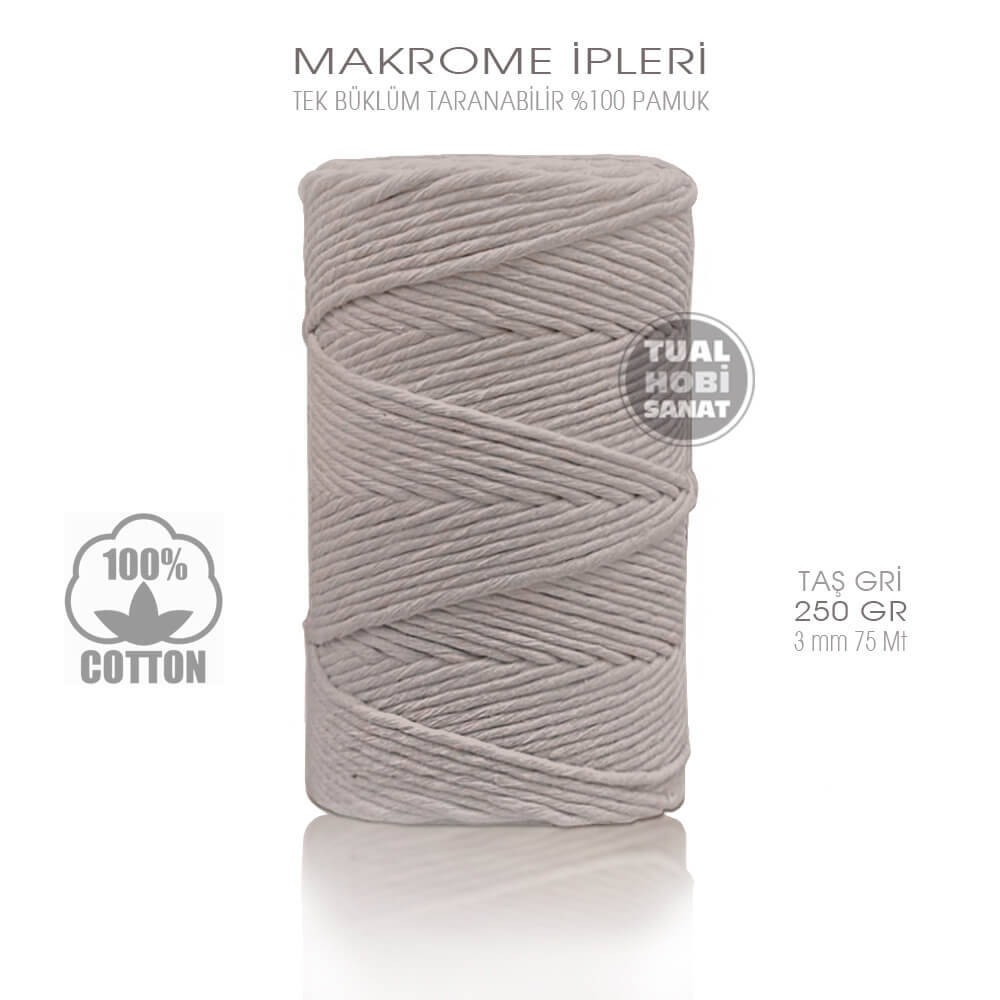 Gelince Haber VerBükümsüz, tek büklüm taranabilir taş gri rengi makrome ipleri, %100 geri dönüştürülmüş pamuk hammaddesinden, tamamen yerli üretim olup, ipler 3 mm kalınlığında, 250 gr ağırlığında ve yaklaşık 75 metre uzunluğunda niteliklere sahiptir. Özellikle duvar makrome yapımı, çanta yapımı, anahtarlık yapımı ve amigurumi oyuncak yapımına uygun olup, solmayan canlı ve doğal renkleriyle harika ürünler elde edeceğiniz doğal iplerdir. Makrome iplerimiz yerli üretim olup, sınıfında yüksek kaliteye sahiptir.